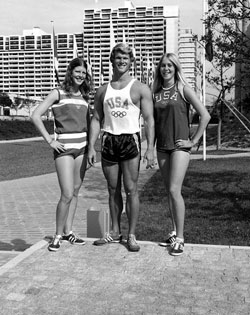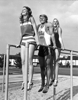 Ell had already selected 2 young female athletes from the US Track and Field team to do the photo shoot and also knew exactly where we could shoot the best photos and find the most interesting outdoor equipment in the training area. We had a lot of fun and got some wonderful photos, some of which are included in this report. When we had finished the shoot, we all went to the Village Cafeteria where we mingled with other world class athletes and had an excellent meal with some of the other American champions who were competing at the games. It was an experience I will never forget and something that could never be done today - without an official press pass!
