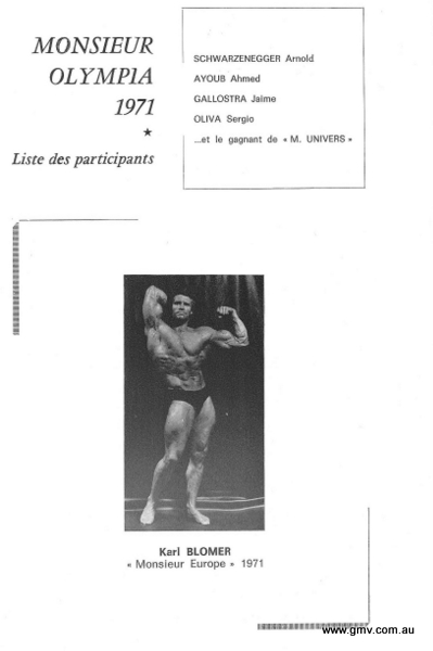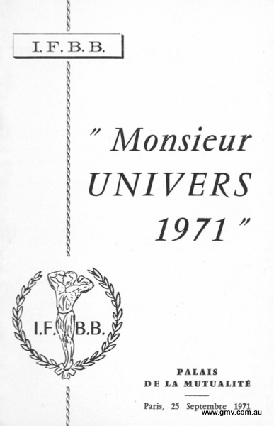 (SPECIAL NOTE: The 1971 Olympia was the first Olympia shot by Wayne and was staged at the Palais De La Mutualite in Paris, France, on 25th September, 1971. The Promoter was Serge Nubret. See a copy of part of the Program below.)