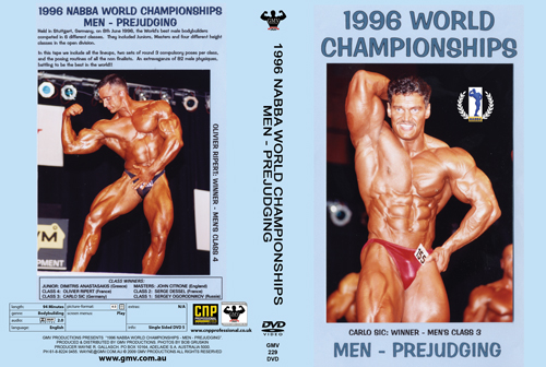The men competed in six different classes including Juniors, Masters and 4 open height classes. The Men's Show DVD presents the top six men as they pose in all six classes, plus posedowns, presentations and the exciting overall judging and posedown for the title of Overall 1996 Mr. World. Highlights include: A fantastic lineup of Juniors - winner Dimitris Anastasakis from Greece; John Citrone winning the masters, giving him a grand slam of every title he could win throughout his illustrious and long bodybuilding career; Colin Murphie, current Mr. Australia, who placed 4th in an incredible tight field; Serge Dessel of France taking the overall title from the handsome and symmetrical Carlo Sic of Germany.