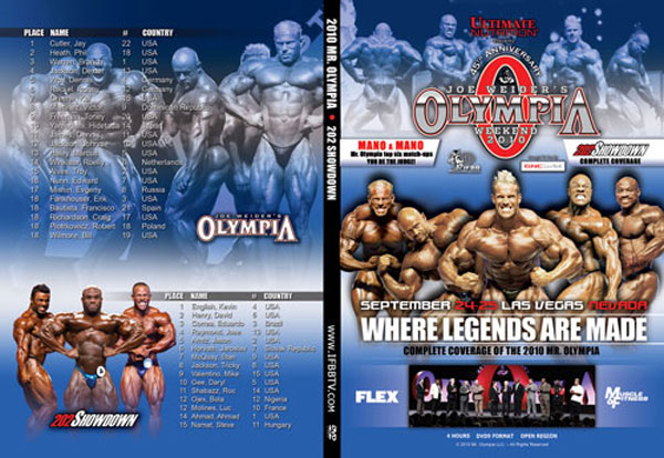 The 2010 Mr. Olympia DVD is a full four hours of magnificent muscle, including the 202 Showdown, complete prejudging footage of every athlete, the “Mano a Mano” feature where you can compare the top six at home, man-to-man, pose-by-pose, and of course all the excitement of the Mr. Olympia Past Winner's Reunion with Joe Weider.